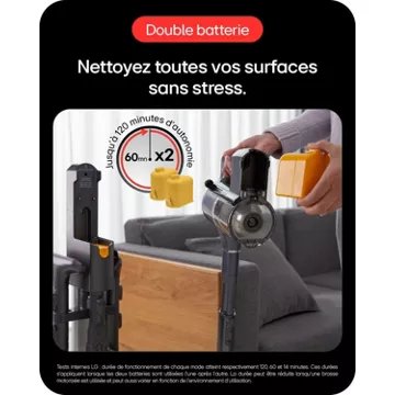 - Détail sur la puissance d'aspiration: : Elle peut varier en fonction du type de sols (parquet, carrelage, tapis, moquette) que vous aspirez et du mode utilisé (standard, éco, boost)