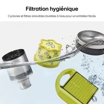 - Technologie d'aspiration : Multi-cyclonique : cette aspiration permet de traiter les grosses poussières ainsi que les particules fines grâce à ses multiples cyclones. Elle offre une force d'aspiration intense pendant toute la durée du nettoyage