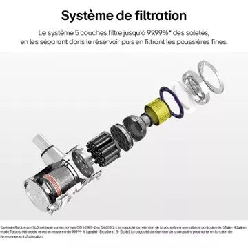 - Système de filtration : 5 étapes de filtration, les aspirateurs à plusieurs étapes de filtration permetttent d'aspirer jusqu'à 99,99% des particules et allergènes