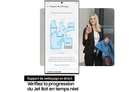 Suivez en temps réel la progression et le statut de nettoyage grâce à l’application SmartThings*. Le rapport de nettoyage en direct permet de suivre à distance les mouvements du robot sur la carte. Vous pouvez voir où le robot a nettoyé, le mettre sur pause ou lui donner des instructions. L’application permet aussi de suivre l’état d’usure des accessoires.
