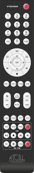 En façade, l'ampli Atoll IN200 Evolution intègre deux potentiomètres métalliques permettant de l'allumer ou de le mettre en veille, d'ajuster le volume et de sélectionner la source. Pour de plus amples fonctionnalités, la télécommande qui accompagne cet ampli permet de gérer la balance et de la mémoriser, de renommer les entrées, de sélectionner le mode de fonctionnement de l'écran (mode allumé ou éteint après 5 secondes d’inaction) ou encore de définir le type de veille (basse consommation ou préchauffage).
