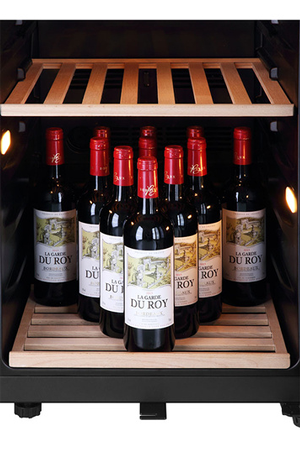 5 clayettes en bois, semi coulissantes accueilleront différents types de bouteilles. La capacité de stockage maximale est de 49 bouteilles de types Bordelaises légères rangées tête-bêche.