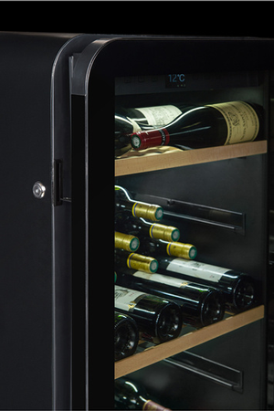La porte vitrée avec serrure en triple vitrage avec un verre gris trempé traité anti-UV laisse apparaître votre collection de vin, disposée face à la clientèle tout en la protégeant des rayons nocifs.