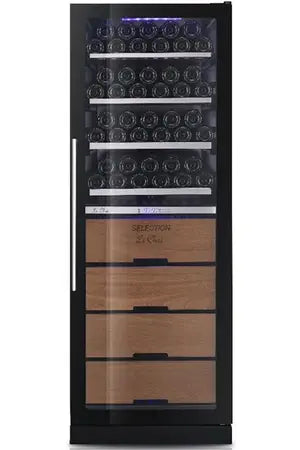 - Zone inférieure équipée avec 4 tiroirs de vieillissement en bois naturel sur rails et ralenti pour un meilleur confort d’utilisation ainsi qu’un filtre à charbon actif pour assainir et purifier l’air de votre cave. Les tiroirs permettent aux vins de rester dans l'obscurité la plus complète.