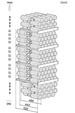 Cette cave peut accueillir jusqu'à 196 bouteilles de type "Bordeaux tradition de 75 cl".