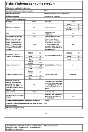| Vitesse d'essorage (tours/min) |