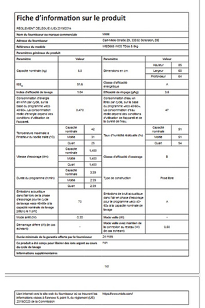 | Vitesse d'essorage (tours/min) |