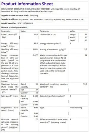 Le lave-linge Samsung WW11DG6B85LB noir est doté d'une capacité de 11 kg avec un tambour d'un volume de 71,5 L. Il dispose de 25 programmes dont le programme Super Rapide 39 min, d'une technologie Al Ecobubble, de l'option anti-tâche, d'un moteur Digital Inverter et d'une connectivité wifi SmartThings.