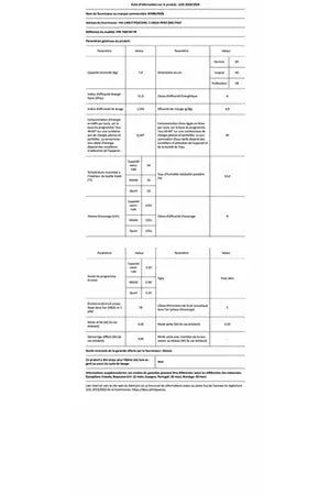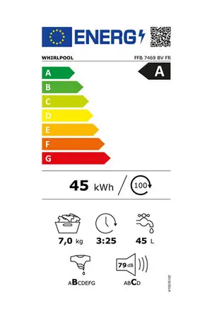 Le lave-linge frontal Whirlpool FFB7469BVFR offre une capacité de lavage de 7 kg avec son tambour de 52 litres. Il est équipé de 14 programmes, y compris Steam Refresh qui utilise de la vapeur pour rafraîchir les vêtements, du système FreshCare+ pour garder le linge frais, d'un programmateur intelligent 6ème SENS permettant d'économiser jusqu'à 50% d'eau et d'électricité, et d'un moteur à induction assurant un lavage efficace et silencieux.