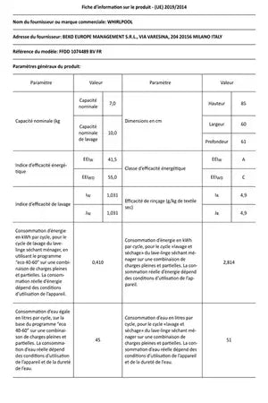 - Capacité de lavage 10 kg / séchage 7 kg - Classe C