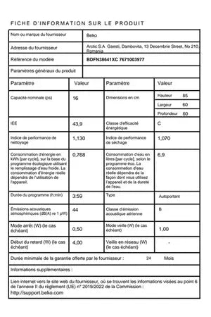 - Largeur 60 cm (16 couverts) - 44 dB - Classe énergétique C