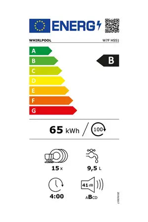 Ce lave-vaisselle Whirlpool W7FHS51 bénéficie d'une capacité de 15 couverts, de 8 programmes dont le programme 6ème Sens, d'une option Power Clean Pro, d'un système Natural Dry et d'un moteur à induction.
