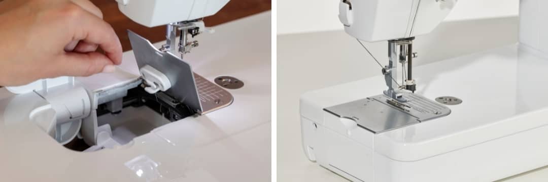 La machine comporte également un système d'enfile-aiguille pour économiser du temps, une genouillère pour faciliter le levage et l'abaissement du pied-de-biche, et un crochet rotatif vertical pour des finitions nettes. L'accès facile à la canette métallique facilite l'entretien de la machine. La tension du fil peut être contrôlée précisément avec le bouton de tension.