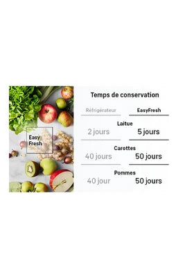Spacieux, le tiroir EasyFresh assure des conditions idéales de conservation pour les fruits et légumes. À une température identique au réfrigérateur, son étanchéité parfaite permet une humidité optimale. Le gaspillage alimentaire est évité car les végétaux conservent leur fraîcheur plus longtemps, sans se dessécher. Garder une salade intacte pendant 10 jours devient possible.