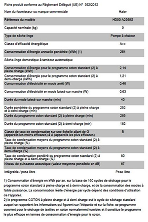 Le sèche-linge frontal Haier Série 295 HD90-A2959R-FR noir, est doté d'une capacité de 9 kg, de 12 programmes de séchage, d'un système pompe à chaleur qui vous permet de réaliser des économies d'énergie, d'une fonction I-Refresh : contre les bactéries et les allergènes, d'un Moteur Inverter - Garantie 5 ans Plus silencieux, plus économe, plus fiable, d'un programmateur Touch et d'un tambour inox de 118 litres.