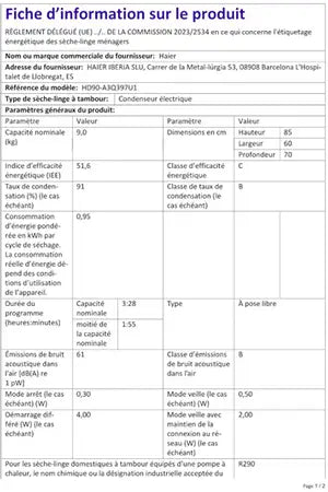 Le sèche-linge frontal Haier HD90-A3Q397U1-S blanc avec hublot noir, est doté d'une capacité de 9 kg, 17 programmes de séchage, d'un système pompe à chaleur qui vous permet de réaliser des économies d'énergie, d'une fonction I-Refresh : contre les bactéries et les allergènes, d'un programmateur Touch et d'un tambour inox de 126 litres.