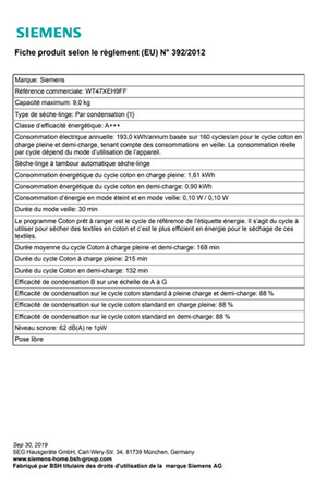 Le sèche-linge frontal Siemens WT47XEH9FF blanc , d'une capacité de 9 kg, est doté d'un contrôle à distance via l'application Home Connect, d'un système pompe à chaleur pour réaliser des économies d'énergie, plus de filtre à nettoyer grâce à son IntelligenCleaning System. Profitez de plus d'espace pour un meilleur séchage grâce à son grand volume de tambour Inox de 112 litres. Ultra basse consommation, ce sèche-linge pompe à chaleur bénéficie d'une classe énergétique A+++.