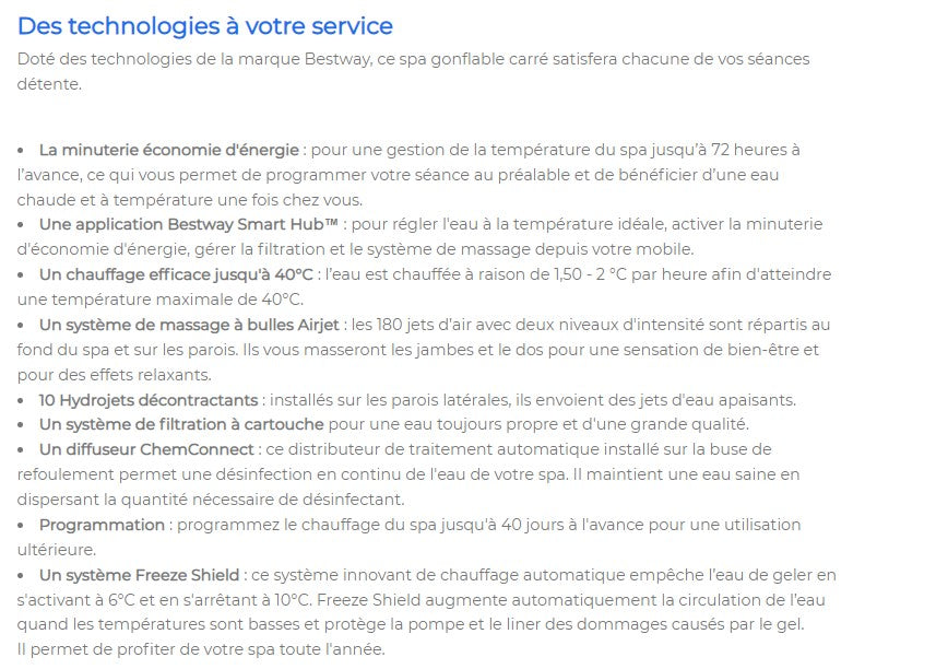 Confortable et résistant, il dispose des dernières technologies de la marque Bestway : le matériau Duraplus pour une structure résistance et durable et des équipements complets pour profiter de votre spa dès son installation.